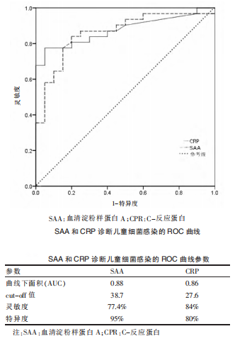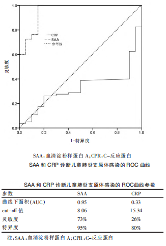 李攀等[3]探討血清淀粉樣蛋白A(SAA)和C-反應(yīng)蛋白(CPR)檢測對兒童支原體肺炎的診斷價(jià)值。包括支原體感染患兒124例(支原體感染組)、細(xì)菌感染患兒35例(細(xì)菌感染組),同期健康體檢兒童20例(對照組),分別測定和分析三組SAA和CRP水平,并應(yīng)用ROC曲線進(jìn)行分析。結(jié)果表明:SAA檢測對診斷兒童肺炎支原體感染和細(xì)菌感染的準(zhǔn)確性均較高;CRP檢測對診斷兒童細(xì)菌感染準(zhǔn)確性較高,但對于鑒別診斷兒童肺炎支原體的意義較小。SAA 檢測可用于兒童肺炎支原體感染的鑒別診斷,應(yīng)在臨床中廣泛應(yīng)用。