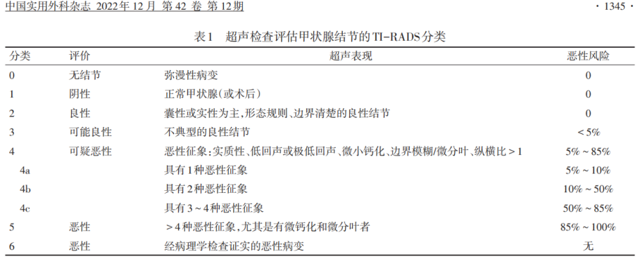 TI-RADS(Thyroid imaging reporting and data system)即甲狀腺影像報告和數(shù)據(jù)系統(tǒng)。依據(jù)五個甲狀腺結節(jié)惡性特征進行分級:①實性結節(jié);②低回聲或極低回聲;分葉或邊緣不規(guī)則;④砂礫樣鈣化;⑤縱橫比≥1。